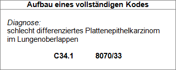 Eine vollständige ICD-O-Schlüsselnummer besteht also aus 10 Stellen bzw. Zeichen, um Lokalisation (4 Stellen), Histologie (4 Stellen), das biologische Verhalten (1 Stelle) und den Differenzierungsgrad einer Neoplasie bzw. deren Äquivalent bei Leukämien und Lymphomen (1 Stelle) zu beschreiben. In Abbildung 9 wird hierfür ein Beispiel gegeben.